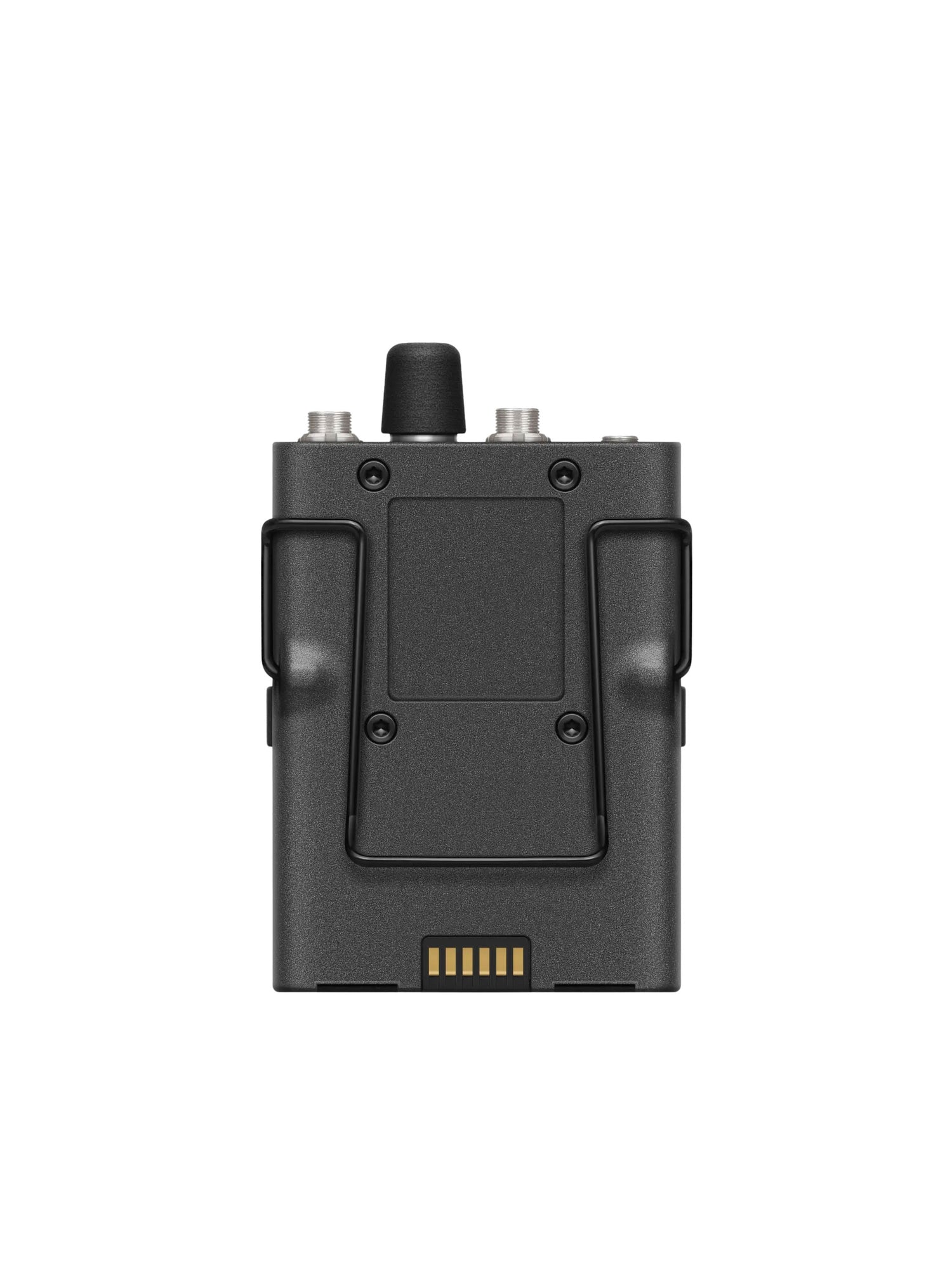 Housed in a durable anthracite-colored chassis, the bodypack includes a 3-pin audio socket input, a 3.5 mm TRS output, and can drive headphones with 2 × 100 mW at 16 ohms. Despite its rugged design, the device is lightweight and compact, making it ideal for extended wear in high-mobility use cases. The system operates without an included battery but supports battery packs and external power solutions.
