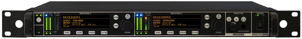 Wisycom MRK980 is a true diversity, ultra-wideband dual channel receiver. With its 1090MHz of band switching, it ensures the users an exceptional band flexibility, combined with a superb selectivity and intermodulation immunity, for best operating performances of the wireless microphone systems. MRK980 also features an internal DSP processor, Wisycom famous Multicompanding system, new Dante compatibility and a completely and renewed user interface, which make this system easy and quick to setup.