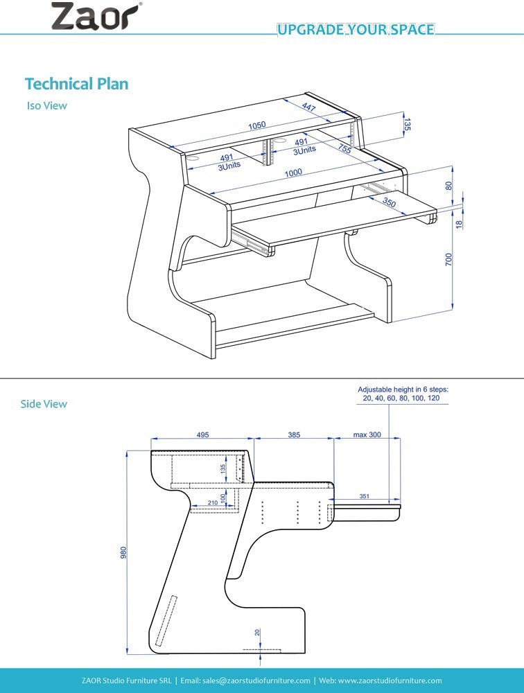 The pull-out keyboard tray can be adjusted to six different heights and holds a 49 key instrument. Above the keyboard tray is the desk surface with room for keyboard and mouse and other desktop peripherals from small mixers to controllers. On top of the space, two rack units invite you to set up your 19-inch gear from sound expanders to preamps to monitor controllers. And if you do not require any rackspace, just leave out the rack rails and use the continued desk space to your liking.