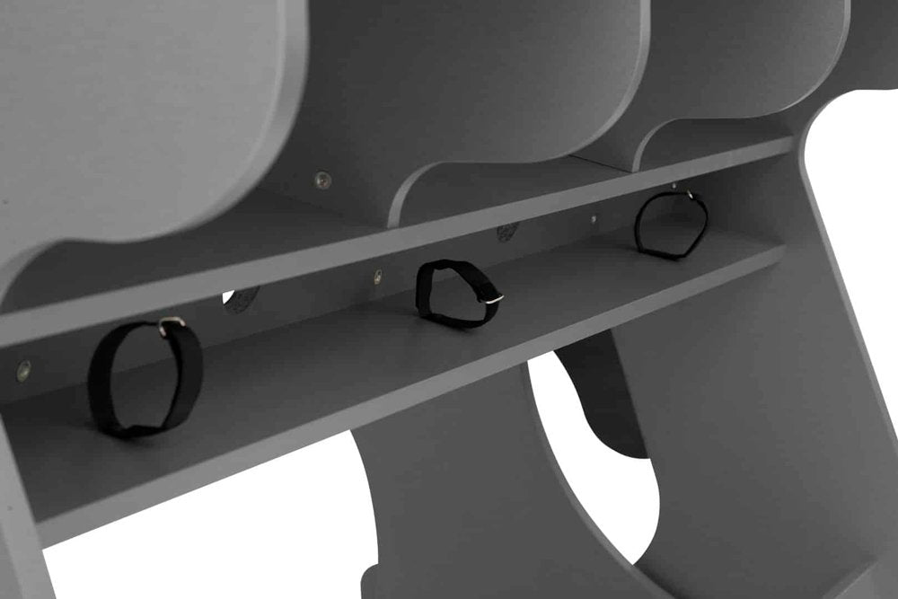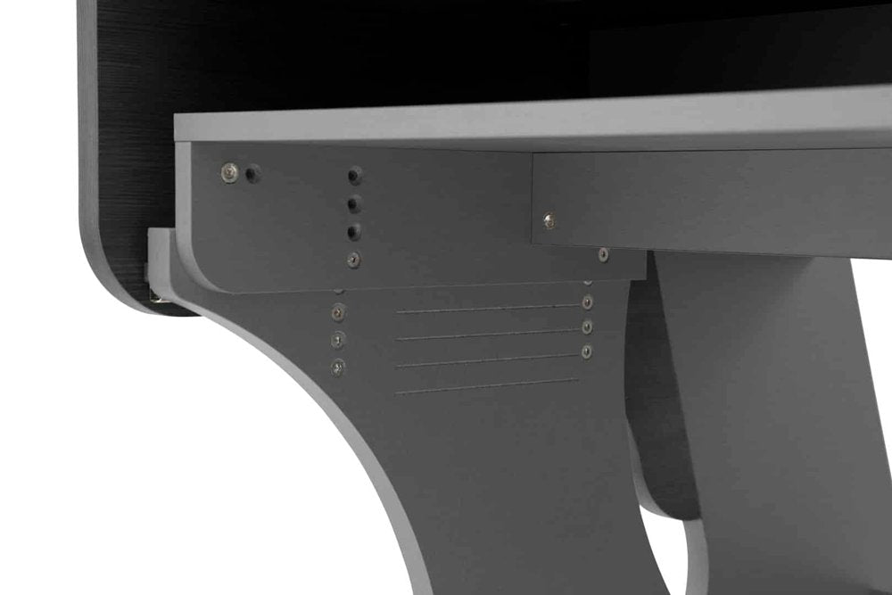 Hardware, software, controllers, and your instrument - have them all at one place with the new Miza 88 FLEX. As the name suggests, this desk was built around the idea of having a full-sized master keyboard with 88 keys at its center and all your rack gear and computer peripherals within reach. The pull-out keyboard tray can be adjusted to six different heights and holds a 76 or 88 key instrument. This new and updated version provides even more tray width for accommodating larger keyboards. Foldable legs for the tray stabilize it when fully extended so any form of wobble is conveniently eliminated, giving you firm, pleasant feedback even when playing forte. Above the keyboard tray is the desk surface with room for keyboard and mouse and other desktop peripherals from small mixers to controllers. In the middle of the desk is a drawer for convenient and neat storage of accessories like cables or headphones. On each side of the drawer, three rack units invite you to set up your 19-inch gear from sound expanders to preamps to monitor controllers. The top shelf above the racks allows you to set up your computer screen or even smaller monitor speakers. The updated and now even more convenient cable management keeps all your wires under control for that tidy, almost magical look and feel. This is your instrument bay. You are home.