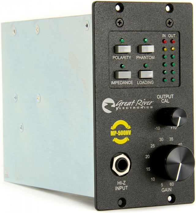 Le MP-500NV est un préamplificateur de microphone de qualité professionnelle conçu pour recréer les caractéristiques sonores vintage des grandes consoles du début des années 1970. Ses composants modernes lui confèrent plus de clarté, de punch et de performances en utilisation normale. De plus, des fonctions telles que la mesure avant et après les principaux étages de gain permettent à l'utilisateur de le piloter de manière créative et d'élargir considérablement ses possibilités sonores. Tous les microphones, qu'ils soient dynamiques, à condensateur ou à ruban, bénéficieront de la puissance du préamplificateur MP-500NV. Le MP-500NV utilise les mêmes circuits audio et de mesure que les préamplificateurs de la série NV. Cet appareil est conçu pour s'intégrer dans un rack de la série « 500 » grâce à deux emplacements disponibles. Il est alimenté par le rack hôte. Il est équipé d'une prise instrument haute impédance avec son propre amplificateur d'entrée et est conçu pour les applications de direct. Toutes les spécifications et tous les détails de performances sont identiques à ceux des préamplificateurs de la série NV, à l'exception de la taille, du poids, de la prise de raccordement et de la sortie -10 dBv.