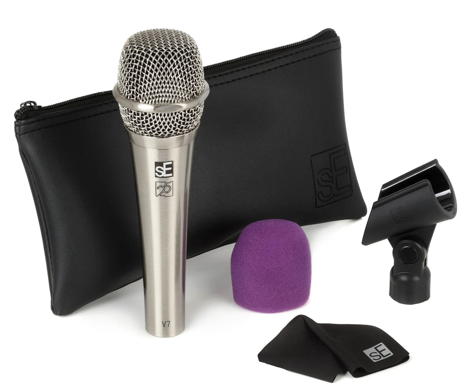 At the heart of the V7 is sE’s proprietary aluminum voice coil and DMC7 capsule, which delivers a crisp, open sound while reducing proximity effect and handling noise. The supercardioid pickup pattern ensures focused audio capture, helping to reject ambient noise and feedback perfect for live venues and loud environments. Its all-metal chassis, integrated shockmount, and beveled grille not only enhance durability but also prevent rolling when placed on flat surfaces. Whether you're on tour or in the studio, the V7 Nickel 25th Anniversary Edition offers a sophisticated blend of reliability, style, and high-performance sound tailored to elevate your voice.
