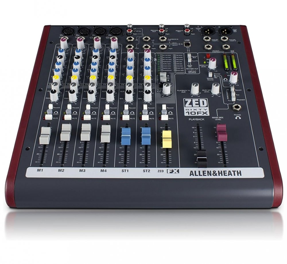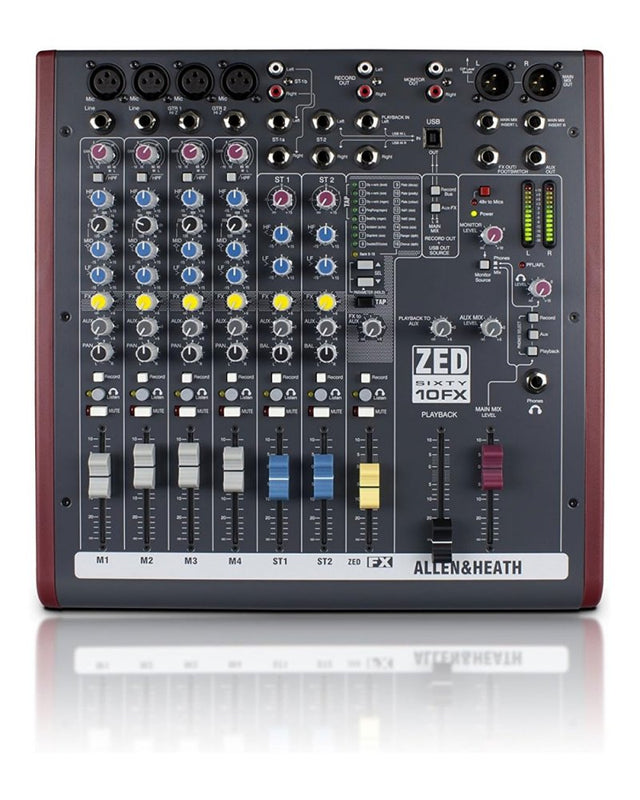 La console Allen & Heath ZED60-10FX est une console de mixage 10 canaux compacte et polyvalente, conçue pour les petits groupes, les artistes solo et les home-studios. Elle associe un circuit analogique de haute qualité à une interface audio USB et des effets numériques intégrés, ce qui en fait une excellente solution tout-en-un pour les concerts et l'enregistrement.