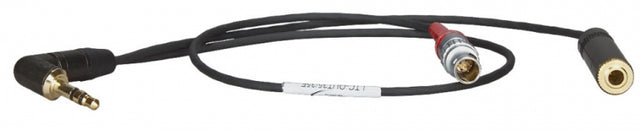 Câble de sortie de timecode avec connecteur Push-Pull 5 broches vers prise TRS coudée 3,5 mm plus jack pour alimenter le microphone et le timecode dans le reflex numérique, câble de microphone vers le canal gauche, câble de timecode vers le canal droit.