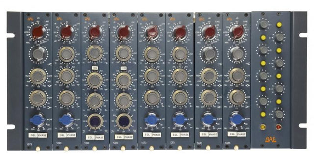 Le rack alimenté à 8 modules BAE (anciennement Brent Averill Enterprises) peut être utilisé avec tous les modules de type Neve 1073, notamment :