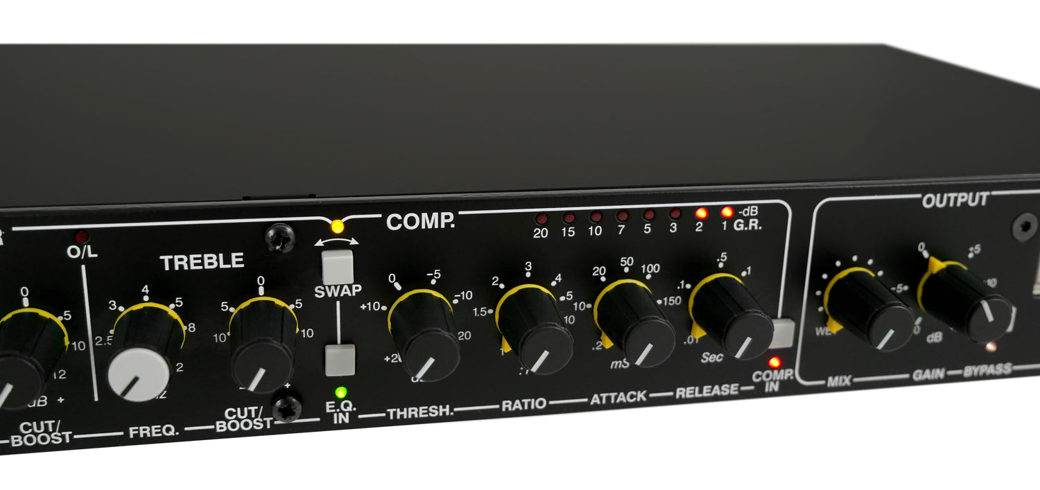 Le 1979 offre également aux ingénieurs un contrôle total sur le ton et la dynamique grâce à un égaliseur fluide et musical, une chaîne de signal flexible (EQ > Comp ou Comp > EQ), et un mélange wet/dry pour le traitement parallèle. Le VU mètre, le gain de compensation et l'interrupteur de bypass rendent la gestion du niveau intuitive et précise. Que vous sculptiez une voix, resserriez une basse ou colliez un mix, le Drawmer 1979 propose un ensemble d'outils flexible et puissant dans un format compact, prêt pour rack, fabriqué à la main au Royaume-Uni selon des normes rigoureuses.