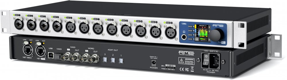 Le RME 12Mic est un préamplificateur de microphone télécommandable à douze canaux avec conversion A/N sans compromis, connectivité AVB et MADI intégrée et une multitude de fonctionnalités conçues pour en faire un compagnon idéal pour tout enregistrement professionnel.