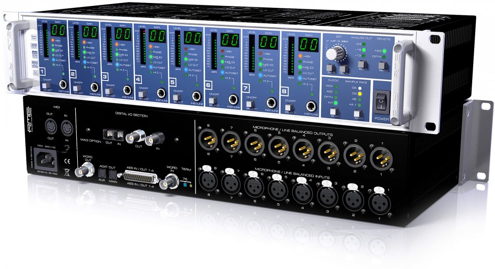 Il peut être utilisé en analogique (entrée micro/ligne vers sortie ligne) et en numérique (entrée micro/ligne vers sortie numérique), les deux voies de signal fonctionnant simultanément. Point fort : l'appareil est entièrement télécommandable via MIDI (y compris MIDI via MADI).