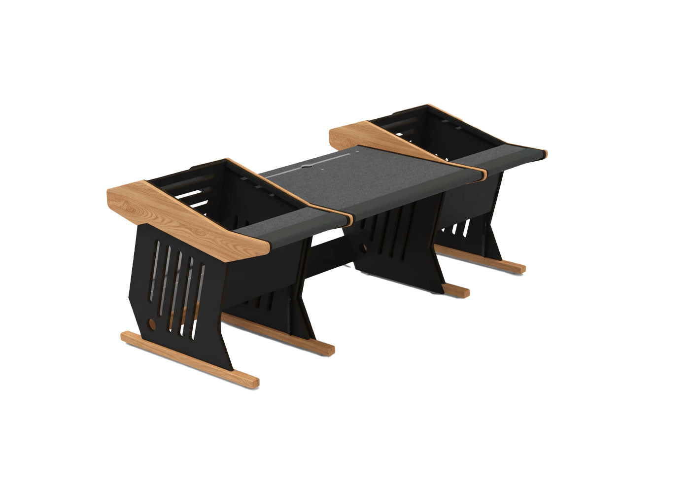 Combines two Maestro Solo racks with a 50" Tela bridge for a spacious and professional production desk.