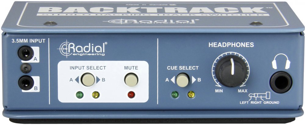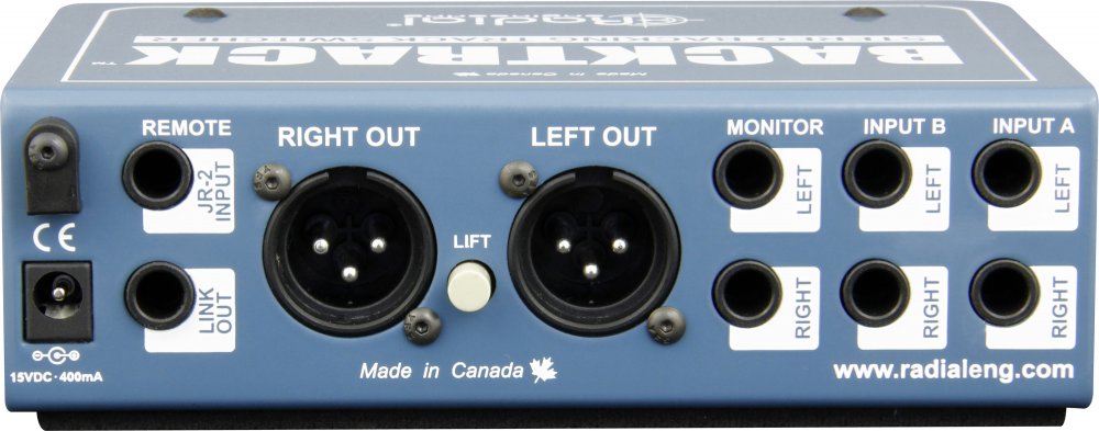 Une fois connecté, un commutateur A/B détermine l'entrée stéréo à utiliser, permettant ainsi d'activer rapidement la source de secours en cas de panne du système de lecture principal. Une télécommande JR-2 peut également être connectée au Backtrack pour changer d'entrée à distance. Lors de la préparation des pistes à écouter, un commutateur de sourdine coupe l'alimentation des sorties principale et de retour, permettant ainsi un contrôle silencieux des pistes via une sortie casque dédiée. Cette sortie dispose de son propre contrôle de niveau et d'un sélecteur d'entrée, permettant ainsi, même en live, de contrôler les deux sources sans perturber les sorties sur scène.