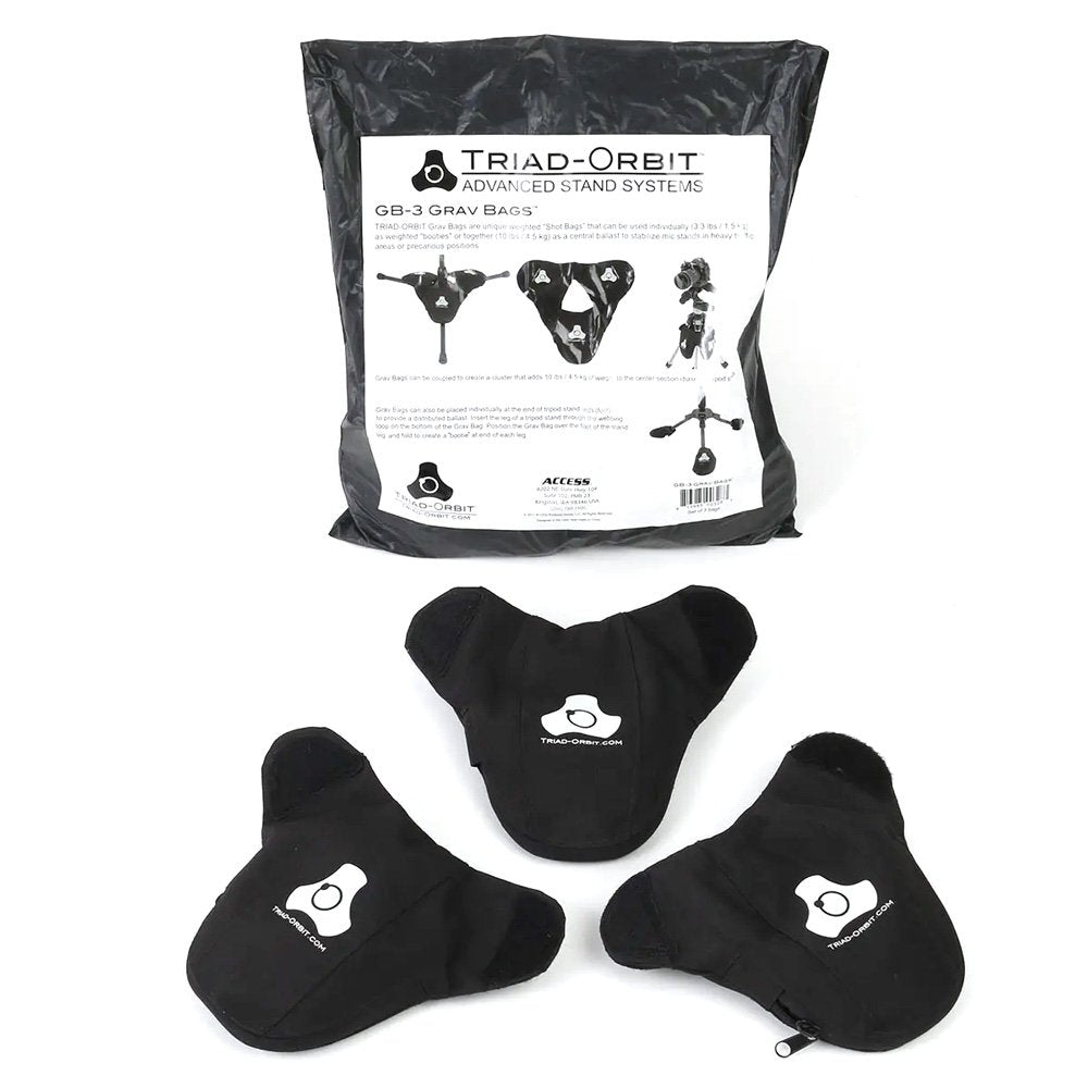 Les sacs de gravité TRIAD-ORBIT sont des « sacs de tir » lestés uniques qui peuvent être utilisés individuellement (3,3 lb) comme « chaussons » aux extrémités des jambes ou combinés (10 lb) comme poids central pour stabiliser les pieds de micro dans les zones à fort trafic ou dans des positions précaires.