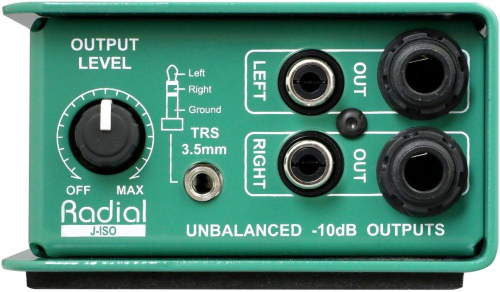 Les Radial J-ISO et Pro-Iso sont des interfaces stéréo à bande passante complète qui convertissent les signaux de niveau ligne symétriques +4 dB en une sortie de niveau consommateur asymétrique.