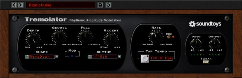 Besoin d'un trémolo ? On a ce qu'il vous faut. Tremolator émule l'effet trémolo d'un matériel classique comme le vieil ampli guitare Fender Vibrolux, et même le superbe son trémolo du piano électrique Wurlitzer.