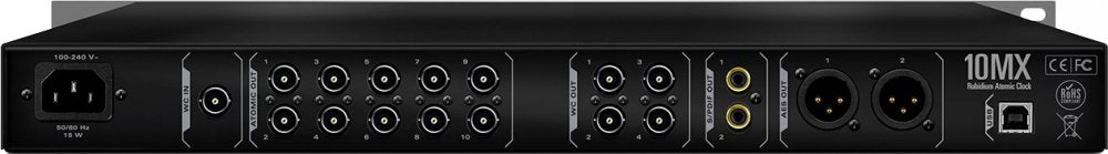 10MX is perfectly suited for recording, mixing and mastering environments. Its form factor, occupying only 1U of rack space, makes it ideal for live sound application where rack slots are precious commodity. The multiple atomic outputs allow up to 10 devices to be clocked simultaneously over BNC outputs of 10MHz. The unit can also be used as a master clock with 4 outputs, supporting the outstanding sampling rate of up to 768 kHz via BNC. Two more clocking outputs are available via AES and two via S/PDIF.