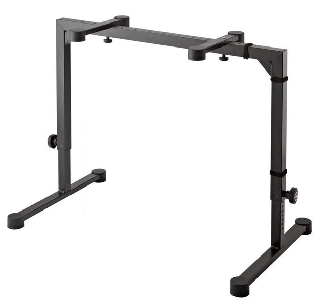 Two sided spring-loaded locking screws make precision height adjustment easy. The support arms can be adjusted to suit the size of the keyboard. When folded, the table is impressively flat. The design of the table complements keyboard bench 14085 or 14086. An optional extra is the 18813 attachment for a second keyboard or laptop. Use the adapter 18814 to mount the microphone boom arm 18956, the music holder 18958, the iPad holder 18816 or the universal holder 18817 easily and quickly.