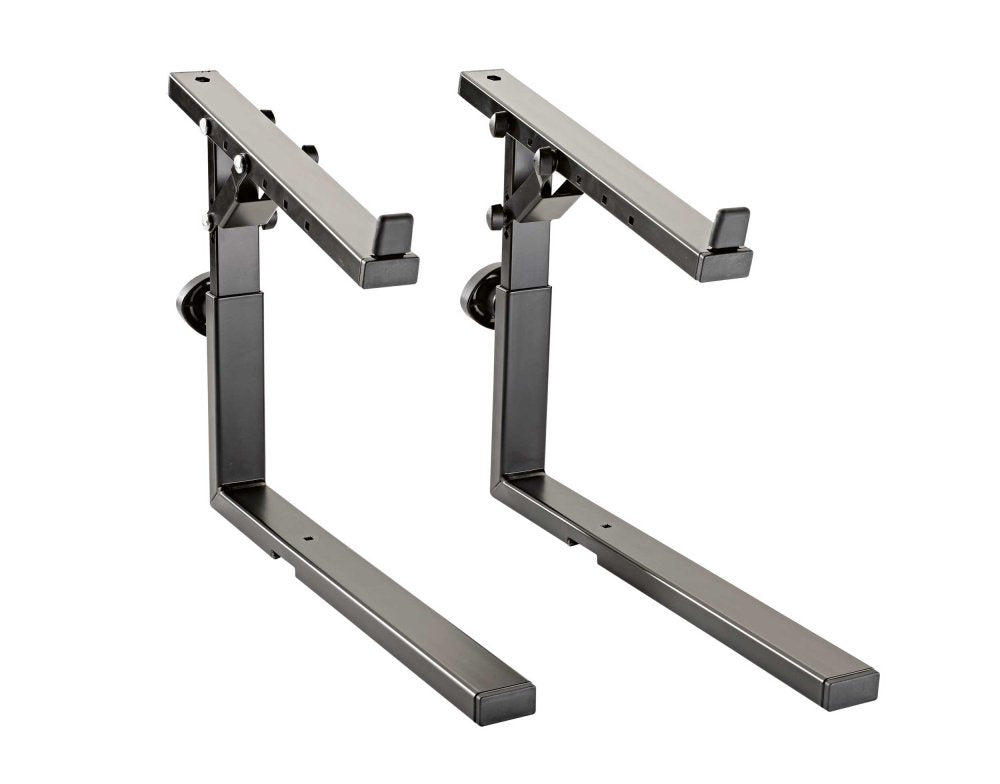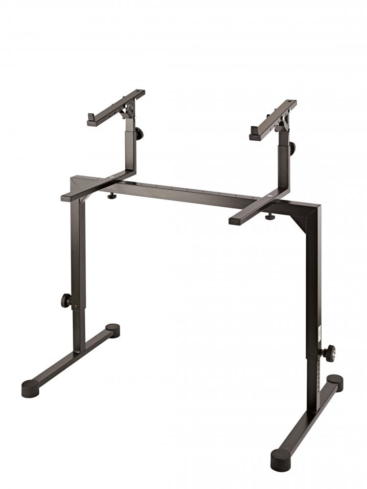 The ideal complement to keyboard stand Omega 18810 to use a second keyboard or laptop. Bigger master keyboards can be placed on the large lower support arms. The depth of the upper support arms can be adjusted to 4 positions, so the lower keyboard remains visible. The desired height of the stacker can be set easily and quickly using the spring-loaded clamping knob. 10 different heights allow each user to be able to find a position that best suits his/her needs. To optimize the position the upper support arms can be adjusted in 5 steps from 0 (horizontal) to a 20 angle. Self-adhesive rubber pads ensure that the instrument is not damaged and stays in place. The stacker is also the basis for an extension to a third level. By removing the back cover, the stacker 18821 can be inserted to take a third keyboard.