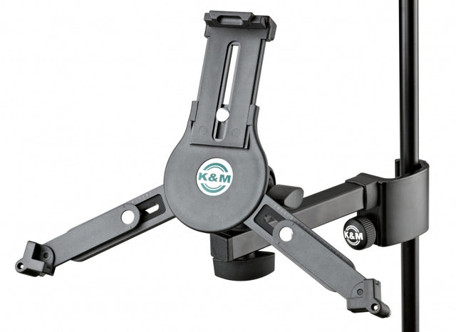 Universal Tablet Holder for different models. The Universal Tablet Holder can be adjusted variably to accommodate different tablet sizes without needing tools and holds the devices securely and effectively for many different situations. Be it on stage, in rehearsal rooms or at home - thanks to the strong clamp element with the ergonomic clamp screw the holder can be attached to any tube up to 30 mm quickly and easily. The individually adjustable support arms can accommodate the use of tablets ranging in height from 222 to 334 mm and width from 128 to 232 mm (for example iPad, iPad Air, iPad Pro, Amazon Fire HDX 8.9, Samsung Galaxy Tab from 9.7, Google Nexus 9, Asus Transformer or Microsoft Surface as well as Surface Pro). The depth of the tablets can vary between 6 and 11 mm. For the first use of the tablet holder the support arms settings are made by adjusting the clamp screws to the size and depth of the tablet. For other uses the tablet can be attached and detached quickly and simply through a snap lock. A handy wing nut allows one to adjust the angle, so that each user will easily be able to find their ideal individual position. The tablet can switch between portrait and landscape positions. The tablet is kept in place, there is no danger of the tablet switching position by itself.
