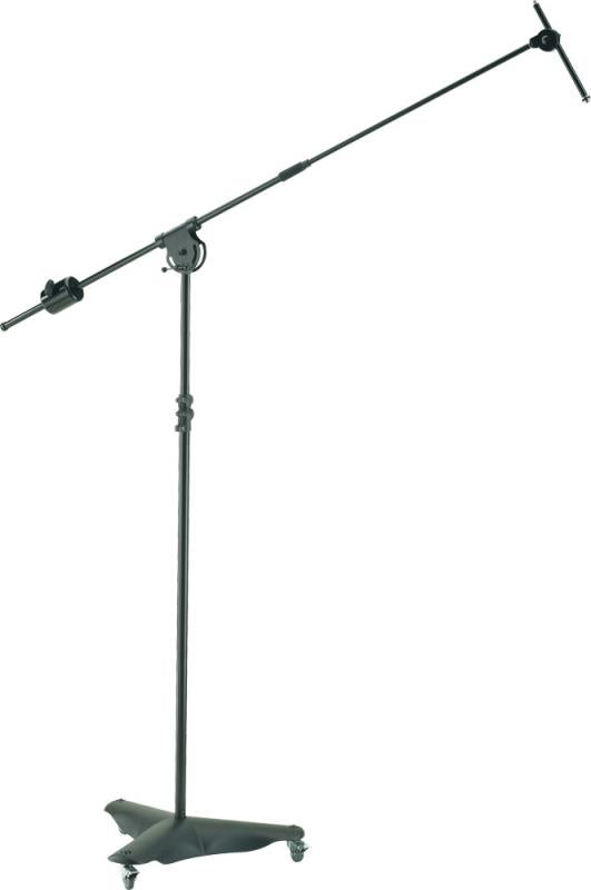 Mobile heavy steel microphone stand for studio or stage. 10 kg cast metal base, low centre of gravity for high level safety with 3 lockable castor wheels.