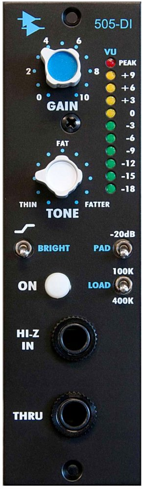 Like the console-based API 205L, the 505-DI is specifically designed to accept a guitar, bass or keyboard direct input while minimizing any loading effect on Hi-Z instrument pickups. Additionally, the 505-DI's Gain Control is used to normalize an instrument's input level, up to a +4 dBu output level. API's unique TONE control reduces potential low end "mud" in the signal, while turning on the BRIGHT switch adds additional clarity if desired. The various combinations of TONE and BRIGHT controls can eliminate the need for any EQ on the instrument while recording, keeping the signal path short and pure.