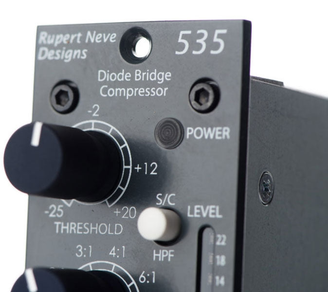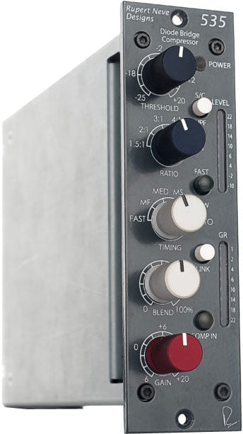 Punchy, thick and versatile, the 535 Diode Bridge Compressor captures the soul of Rupert Neve's original 2254 compressor while providing modern updates including advanced timing control, significantly lower noise, fully stepped controls throughout, and internal parallel processing capabilities. Originally developed for the dynamics circuit of the acclaimed Shelford Channel, the 535 is outfitted with Rupert Neve Designs' custom transformers and class-A output amplifiers, all tailor-made for the popular 500-series format.