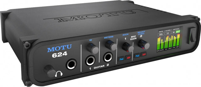 The MOTU 624 hybrid audio interface packs high-end sound, ultra-low latency, and generous I/O into a portable half-rack unit. ESS Sabre32 DAC technology delivers an impressive 123dB of dynamic range on balanced, DC-coupled analog outputs. Experience round-trip latency as low as 1.6ms at 96kHz via Thunderbolt and 1.9ms via USB. 32 total channels of audio I/O make connecting your instruments, microphones, and outboard gear easy. An onboard DSP mixer provides latency-free routing, along with an array of powerful digital effects. Use the 624 as a standalone mixer, or control it wirelessly from your tablet, smartphone, and laptop. Both onstage and in the studio, the MOTU 624 delivers.