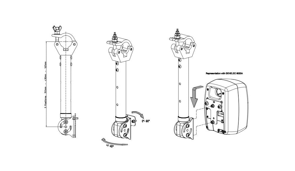 Flexibly position your loudspeakers on a truss with this adjustable mounting kit. The quick length adjustment feature with three different positioning options, at 355mm, 430mm, and 505mm, makes positioning easy. The kit includes a clamp for a Ø50 mm truss tube. Available in black colour.