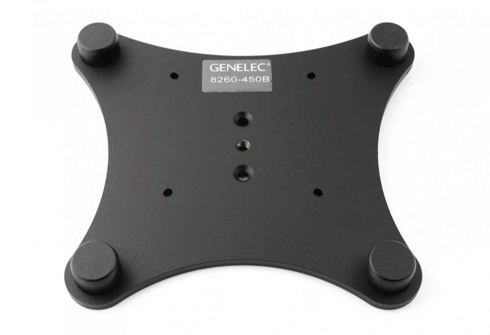 8000 series Genelec stand plates are designed for use together with the Iso-Pod that comes with all 8000 series monitors. The Iso-Pod allows you to tilt the monitor for optimal alignment. Simply mount the stand plate onto the 3/8" thread on the tube and ensure tight screw connection. Place the Iso-Pod over the four pins of the stand plate.