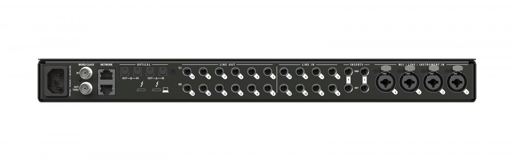 A 64-channel, 32-bus mixer with 32-bit float processing provides EQ, compression, HPF, gate, and reverb on every input/bus. Four transparent mic/DI inputs (-114 dB THD+N, +74 dB gain) include inserts on 3"4, plus 12 DC-coupled line outs, dual headphones, and ADAT/SMUX/TOSLink digital I/O. Integrated AVB networking (2- Gigabit) streams up to 128-128 channels over Ethernet with fixed 2 ms network latency, and the CueMix Pro app controls everything from desktop or iOS.