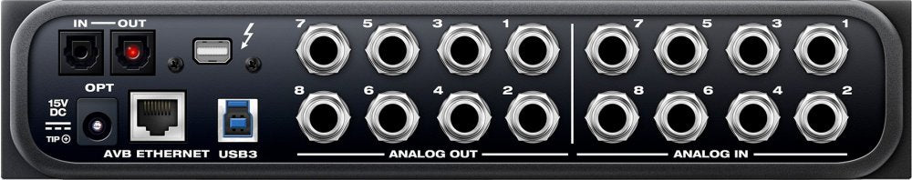 34 simultaneous audio channels You get 8 x 8 balanced analog, 8-channel ADAT optical and independent headphone out for 16 inputs and 18 outputs. The optical ports also support stereo TOSLink (optical S/PDIF).