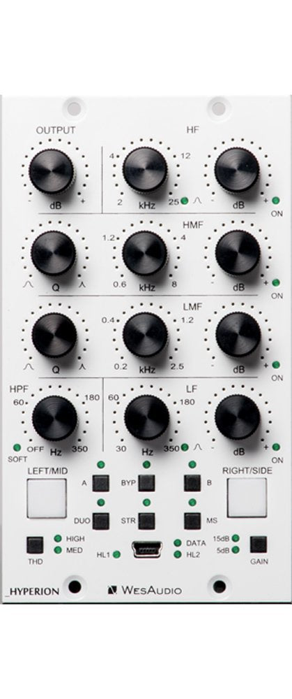 HYPERION is fully analog parametric EQ with +24dBu of headroom. It features a lot of innovative improvements that no other processor on the market provides. Its innovative design utilizes 15 VCAs per channel to provide essentially noiseless parameter changes and very musical nature. _HYPERION is next product in NG500 line where total recall is implemented through front panel USB socket or _TITAN chassis.