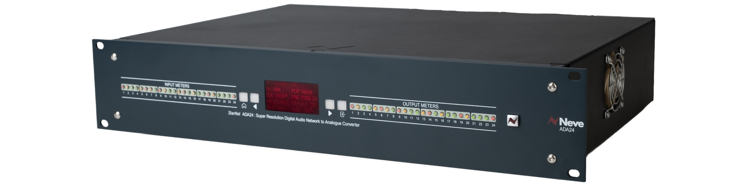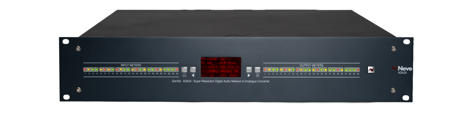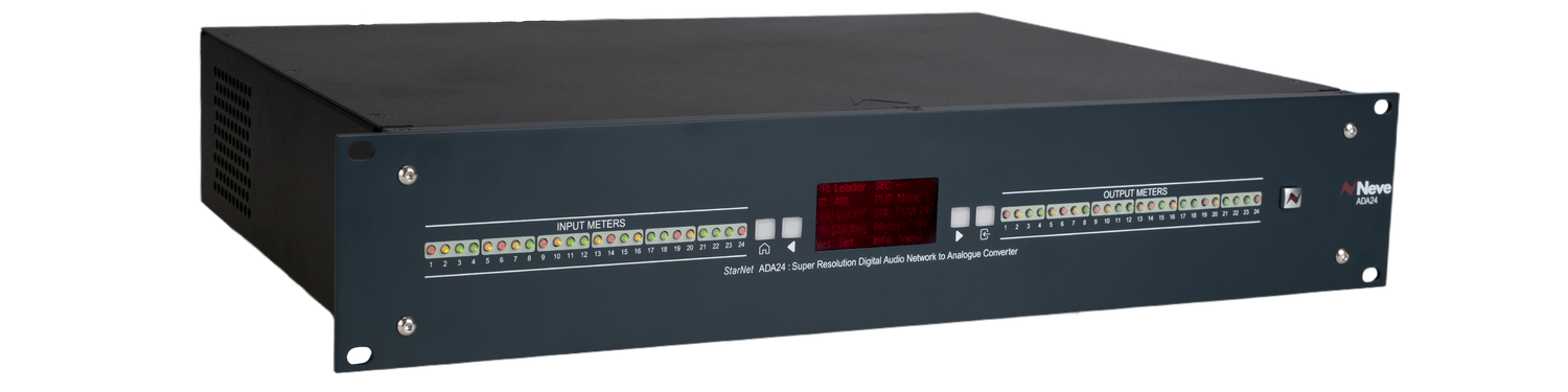 The Neve StarNet ADA24 is a 24x24 mastering-grade analogue-to-digital and digital-to-analogue converter built for seamless integration into Dante™ audio-over-IP systems. Designed for professional recording, post-production, broadcast, and live sound environments, it provides transparent, high-resolution conversion in a robust 2U rackmount chassis. The ADA24 features 32-bit integer resolution with support for sample rates up to 192 kHz, ensuring detailed and accurate audio across every input and output.