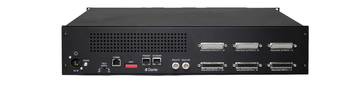 Balanced DB25 connectors deliver 24 channels of line-level analogue I/O, with selectable headroom settings (+18, +24, or +26 dBu) to match a range of studio and broadcast standards. Clocking is handled by a precision low-jitter system with internal and external word clock sync options. Dual Ethernet ports offer Dante redundancy or daisy-chaining across larger networks. The front panel includes an OLED screen for quick access to sample rate, clocking, network status, and full I/O metering, with additional visual indicators for signal and clipping.