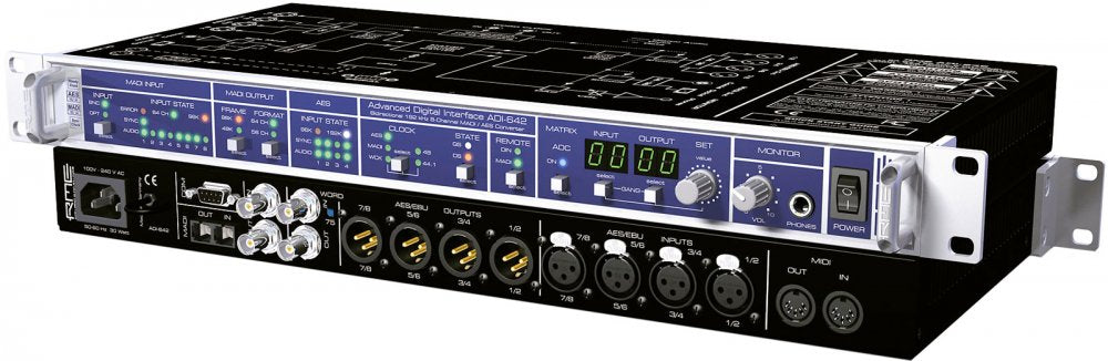 The ADI-642 supplies word clock in Single, Double und Quad Speed, distributes Double Wire 96kHz signals into the MADI data stream and to the AES ports, and even supports the double MADI sample rate (96K frame). The SyncAlign and SyncCheck technologies known from other RME products ensure perfect synchronization and clear detection of errors. Also multiple units can be stacked and operated sample-aligned, using word clock. All settings are stored when the unit is switched off.