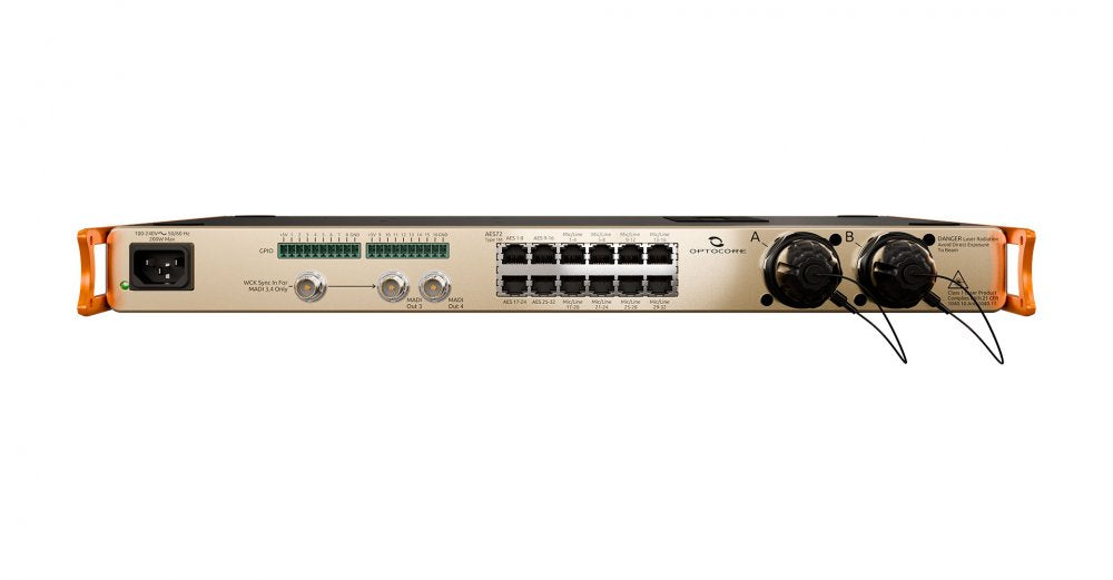 Designed for reliability and flexibility, Astral Opto also includes a fully redundant AC mains supply, ensuring uninterrupted performance during critical live events. Beyond Optocore, it expands the ARX32's connectivity with a wide range of additional I/O, including a second set of analog and AES outputs, GPIO connectors, and two extra MADI outputs with independent sync input.
