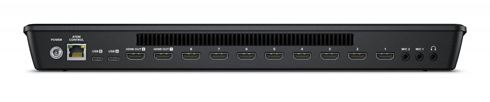 ATEM Mini's compact all in one design includes both a control panel as well as connections. The front panel includes easy to use buttons for selecting sources, video effects and transitions. The source buttons are large so it's possible to use it by feel, letting the presenter do the switching! You even get buttons for audio mixing! You also get buttons for record and streaming control, as well as output selection buttons that let you change the video output between cameras, program and multiview. On the rear panel there are HDMI connections for cameras or computers or even gaming consoles, extra microphone inputs, USB for webcam out plus an HDMI "aux" output for program video.