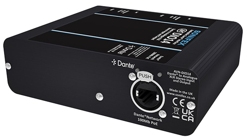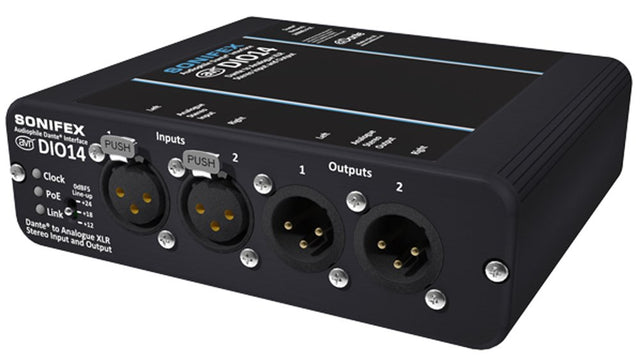 The Sonifex AVN-DIO14 is a compact audio interface that facilitates the integration of analog equipment with Dante Audio-over-IP (AoIP) networks. It features two balanced analog XLR inputs and two balanced analog XLR outputs, allowing for seamless bidirectional audio conversion. A Neutrik etherCON connector provides a robust connection to the Dante network.