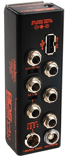 Remote Audio's BDS system consists of a reverse-polarity protected and overload protected distribution box with illuminated bi-color on/off switch, six standard outlets, a power source (typically a rechargeable battery such as the NP-1), an input cable, and output cables to the devices being powered. BDSv4u also has a USB power outlet and a 6-pin port for remote accessories.