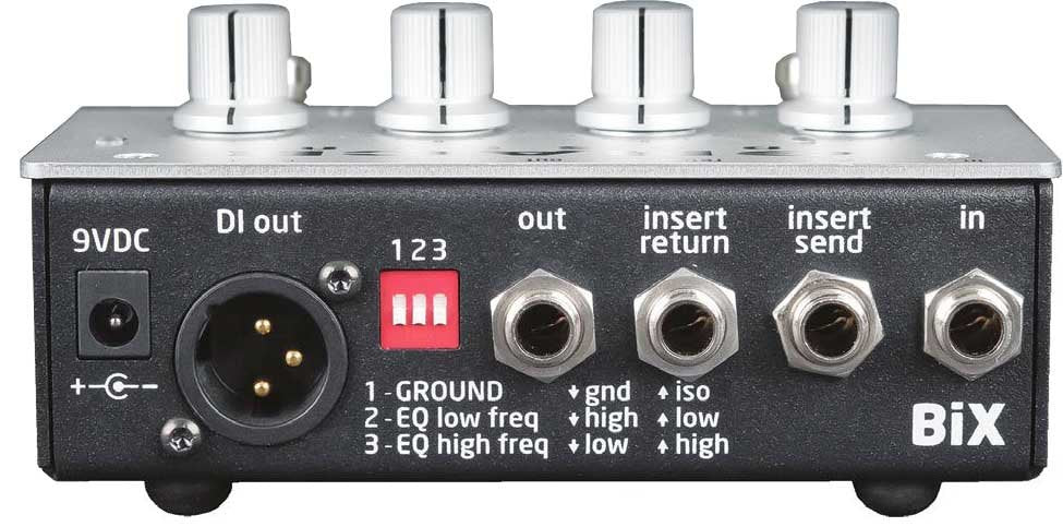 Controls are dead simple - input gain, high and low shelving EQ, and a 10dB variable boost circuit, with footswitches for mute and boost. I/O includes the instrument input, separate send and return insert jacks, an unbalanced line output, and a balanced ISO DI output on XLR. For enhanced EQ control, rear panel DIP switches select between two different transition frequencies for both High and Low controls. And BiX is pedalboard friendly, with a 9VDC power input and a compact, rugged low-profile chassis.