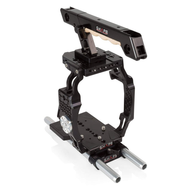 C200 Cage and rod bloc system The SHAPE Camera Cage is designed for use with the Canon EOS C200 cinema camera. It is made of CNC Machined aluminum and offers several mounting points and threaded holes to attach other SHAPE parts and third-party accessories. The cage also includes an ARRI rosette on the right side for attaching the Remote Extension Handle or C200 Handle. Bottom section of the cage features an adapter plate with several 1/4″-20 and 3/8″-16 threaded holes, suitable for optimizing your C200 camera balance on a tripod, gimbal, or drone. Top section of the cage features a top plate, allowing you to mount the C200 Top Handle at different positions to optimize your balance when shoulder-mounted. Finaly, you can quickly adjust or remove the cage with the help of an Allen key, included and magnetically attached to the bottom of the cage.