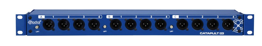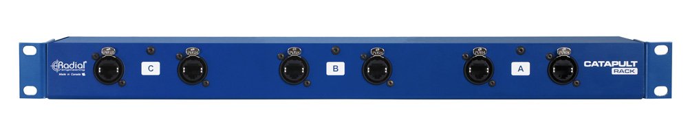 1 Rackspace, 3 times the channel count The Catapult Rack units operate like three modules in one chassis. Since each Cat 5 Ethernet cable can carry four channels, the 12 XLRs on each Catapult Rack are split into three banks, each with their own noise-eliminating ground lift switch and RJ45 Ethernet jacks on the rear panel. You can use three Ethernet cables to connect all 12 channels to a single location, or split them off to any of the Radial Catapult stage boxes, providing you with a fully customizable audio snake system that can connect multiple destinations at once and even include transformer isolation where needed.