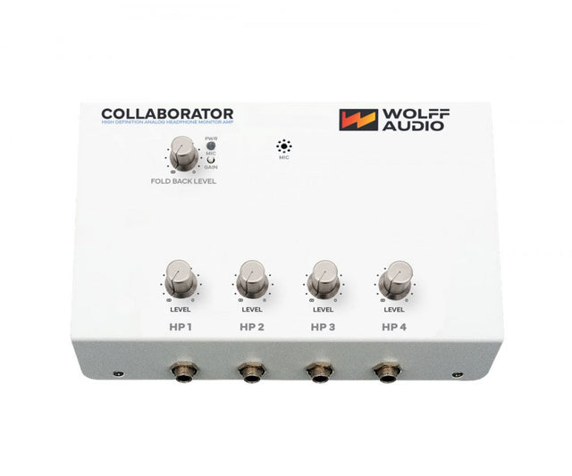 The Wolff Audio Collaborator is a high-definition analog headphone amplifier system designed for seamless artist collaboration in studio environments. It features four independent headphone amplifiers, each with its own dedicated level control, ensuring precise monitoring for multiple users. Housed in a solid steel enclosure, the Collaborator is built to deliver both durability and exceptional sound quality. An external high-powered PSU provides ample headroom, ensuring clean and dynamic audio performance.
