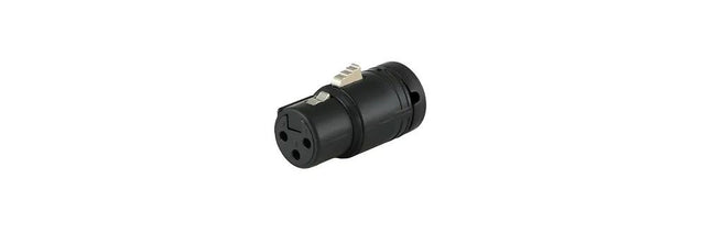 Low-Profile Right Angle XLR 3-pin Female Connector, A-Shell = Adjustable Multi-angle cable exit 120 around 3 o'clock or 9 o'clock, matte Black shell with gold pins. Available in 10 interchangeable Cap colors: Black, Red, Blue, Green, Yellow, Orange, White, Gray, Purple and Brown.