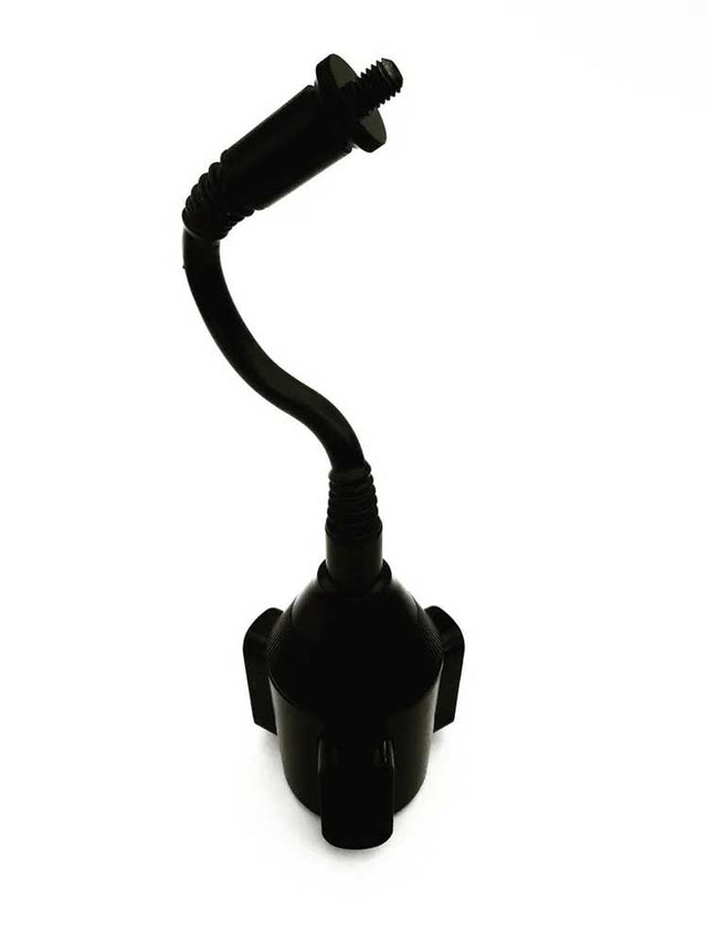 The CupRig is a Microphone mount designed to be placed in a cup holder of a vehicle. The CupRig has a strong enough neck with the standard 3/8th mic thread to hold any shock mount and microphone combination. The base twists open and close to grip any size cup holder allowing for stable Mic placement in moving or static vehicles. The extra large thumb nut allows for micro adjustments of the shock mount once the rig is in place. The Cup Rig is a very useful set up to have as an addition to hiding microphones in visors or as an alternative to trying to clamp mics in awkward places.
