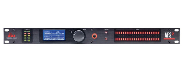 The dbx AFS2 is a standalone feedback suppression processor designed for both live and installed sound systems. It features a completely re-engineered Advanced Feedback Suppression (AFS) module and an intuitive full LCD display for setup and real-time monitoring. With its Wizard Setup function, the AFS2 eliminates the complexity of tuning for room acoustics, making feedback control both easy and precise.