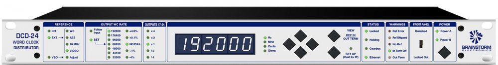 Flexible Output Frequencies The DCD-24 provides word clock at frequencies up to 192KHz locked to its high precision internal crystal or to an external reference - WC, Video Sync (all standard HD & SD rates), AES3 or 10 MHz (from GPS or Rubidium clocks). The rate of the reference (input) is automatically measured and "learned" while the output rate can be either identical to the input ('follow input' - WC or AES only) or set to any other frequency regardless of the input rate. Outputs 17-24 have a multiplier/divider so that 2 different rates can be distriibuted simultaneously by the DCD-24, for example 48K and 96K.