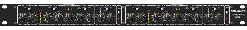Positioned in the Drawmer range over the industry standard DS201 Dual Gate, the DS501 Power Gate features a new dual mode 'tuneable' Peak Punch processing section on each channel. In tuneable mode a fully variable frequency selector with a range from 75Hz to 16kHz allows the user to shape the transients of the gated signal and 'tune-in' to the particular area of the audio spectrum where the Peak Punch is to be active. In addition a variable 'more' control allows the user to tailor the amount of processing. A secondary Full Band Peak Punch mode is also available.