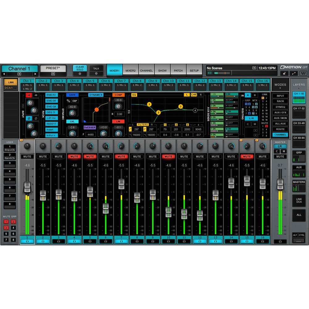 The Waves eMotion LV1 64 Stereo Channels software is the most powerful version in the LV1 series, offering a comprehensive live sound mixing solution for high-demand front-of-house, broadcast, and monitor applications. Designed for seamless integration into the SoundGrid ecosystem, this software delivers precise, studio-grade audio with 64 stereo/mono input channels, 36 bus/return channels, and a flexible, real-time mixing workflow.