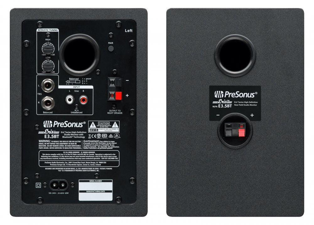 Connectivity is where the E3.5 BT really shines. In addition to Bluetooth for cable-free streaming, you get rear-panel RCA and balanced 1/4-inch TRS inputs, a front 1/8-inch aux input, and an integrated headphone amplifier with a convenient front-facing jack that automatically mutes the speakers. Built-in acoustic tuning controls allow you to tailor the frequency response to your room, adjusting both the highs and lows for optimal clarity and balance. Wrapped in a rugged MDF cabinet with vinyl laminate, the Eris E3.5 BTs are built to look great and sound even better in any desktop or home studio setup.