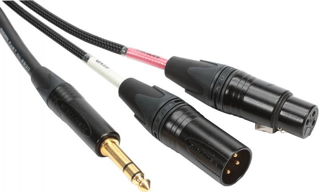 The cable has an oxygen-free copper core for transparent audio. The carbon-impregnated PVC jacket eliminates handling noise, while the ultra high-density spiral shield and conductive polymer sub-shield reduce EMI and RFI interference. The cable is 6' long and has a gold-plated 1/4" TRS plug at one end and a pair of XLR connectors at the other, one male and one female.