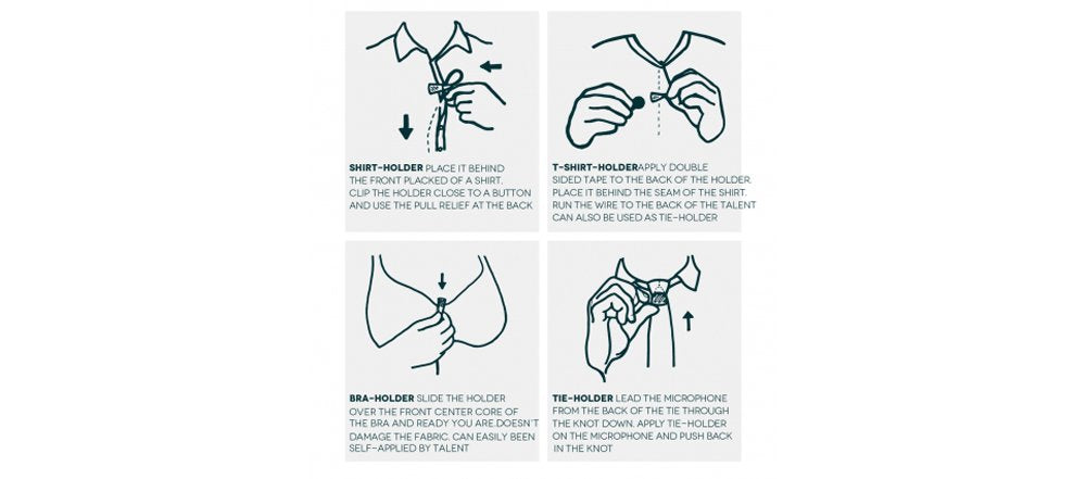 Shirt-holder, Bra-holder, T-shirt-holder and Tie-holder. With this set you can hide your DPA lavalier mics quick, discreet and without any clothing noise.